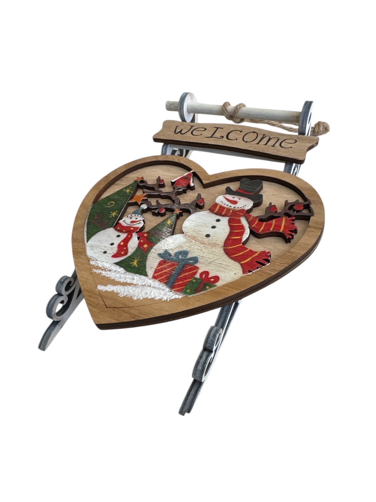 DRVENI UKRAS ZA VRATA U OBLIKU SRCA SA ZIMSKIM PEJSAZEM UNUTAR NJEGA