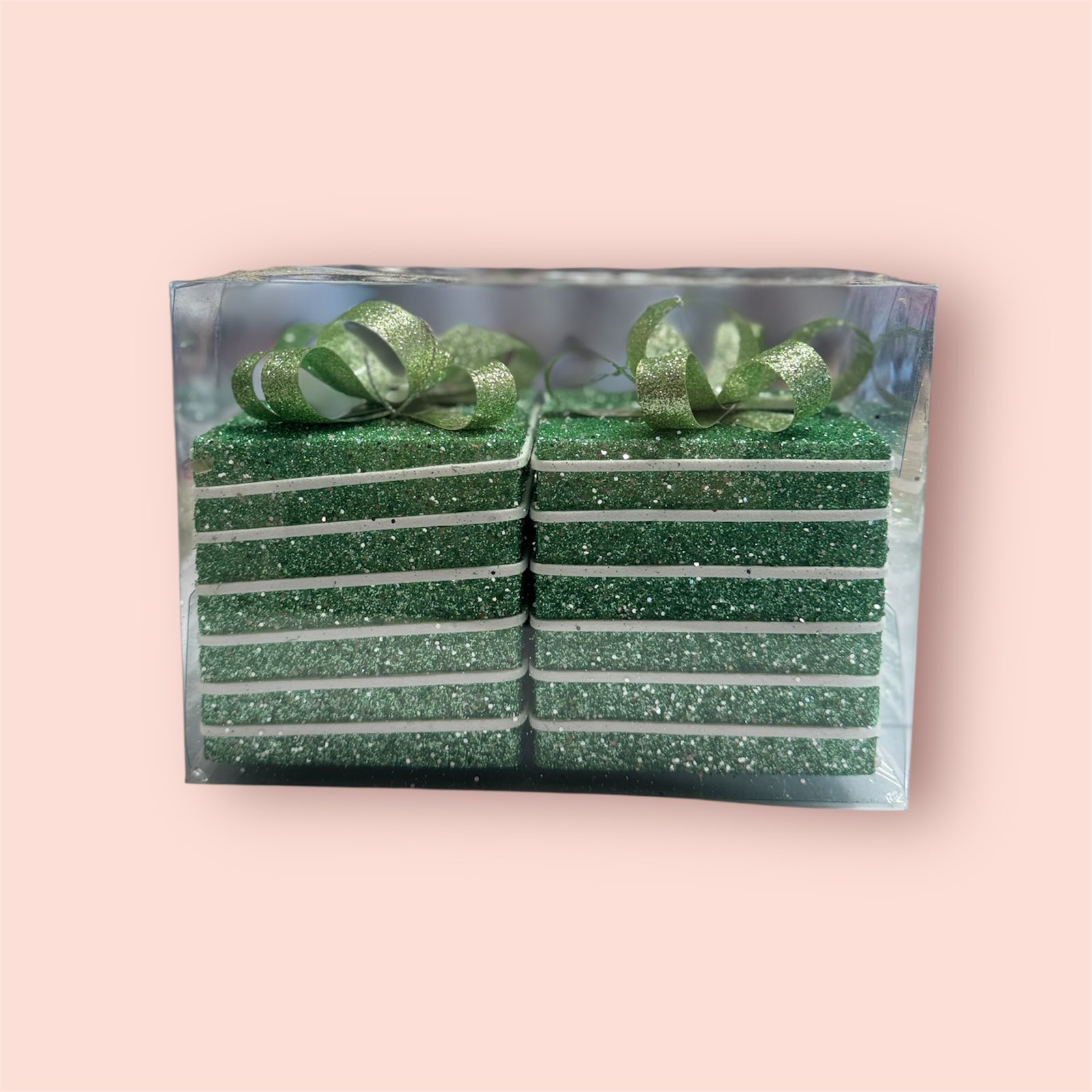 Ukras u obliku poklona zelene boje. Set od dva ukrasa.